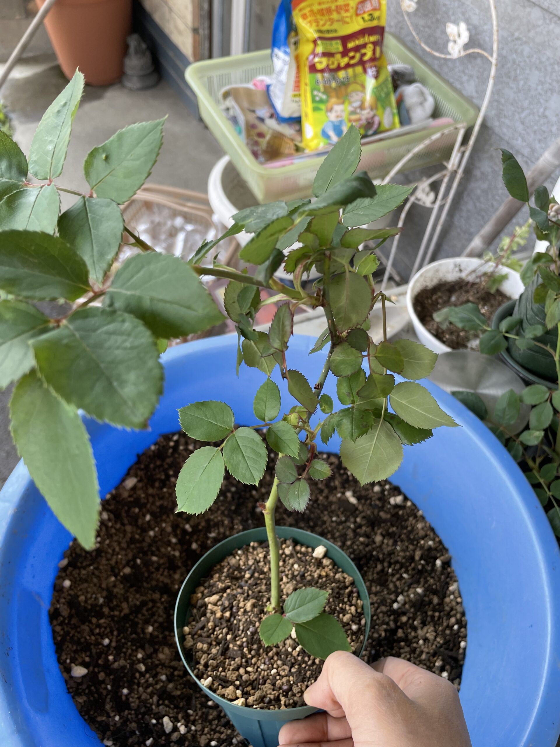 ポンポンと両手で持った鉢を軽く落とし、土をなじませて、オルトラン、緩効性肥料(マグァンプ)を入れて、お水をたっぷりあげます。