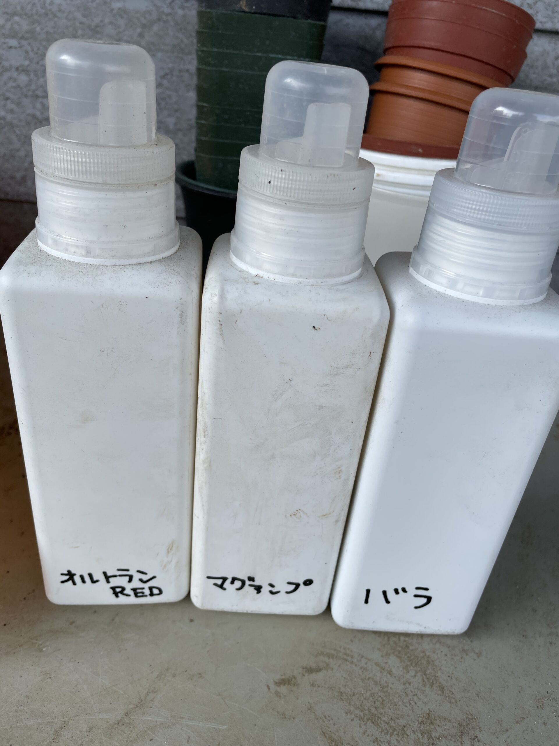 これらをダイソーの洗剤入れにそれぞれ詰め替えて土にふるだけです。