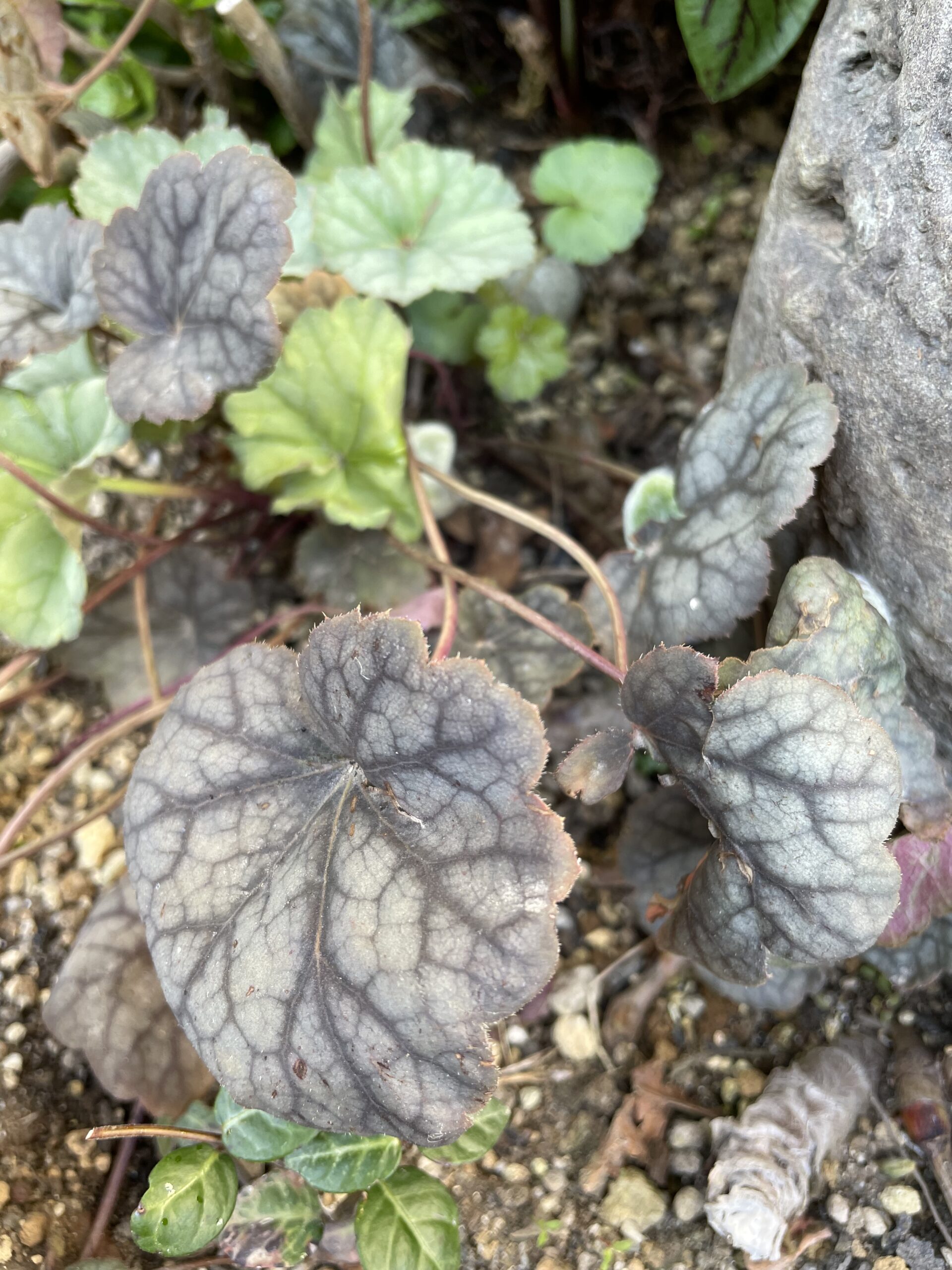 春になってくるとヒューケラの株がモリモリ💪成長してきて、色とりどりの葉が、