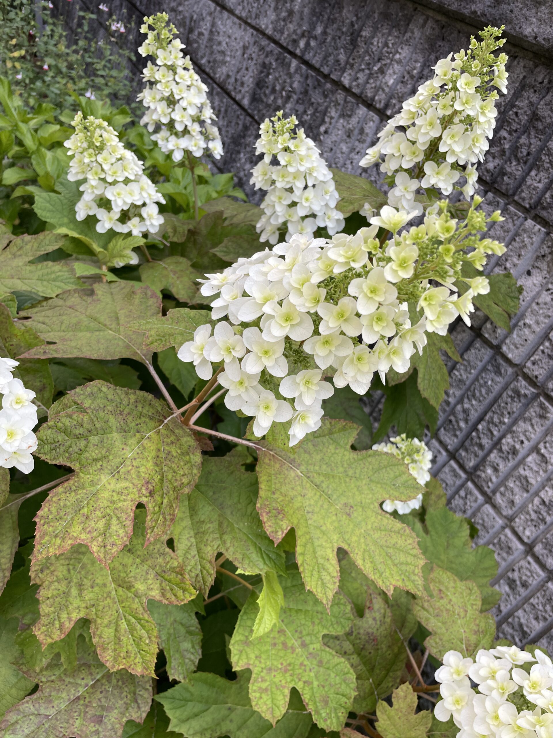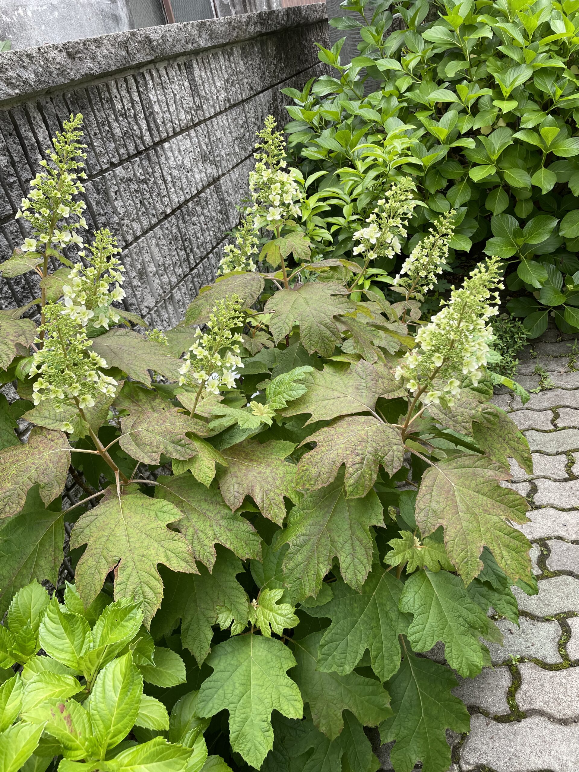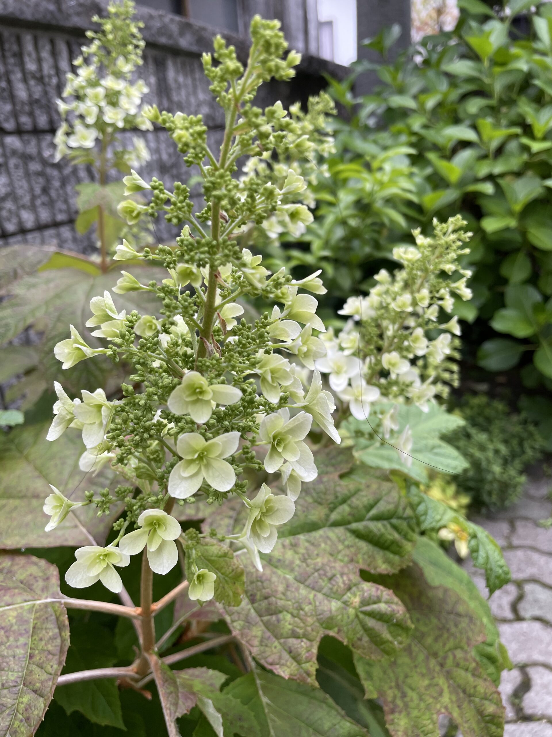 カシワバアジサイは丸じゃなくて、すらっと穂状になったピラミッド型の花を5月~7月頃に咲かせます。