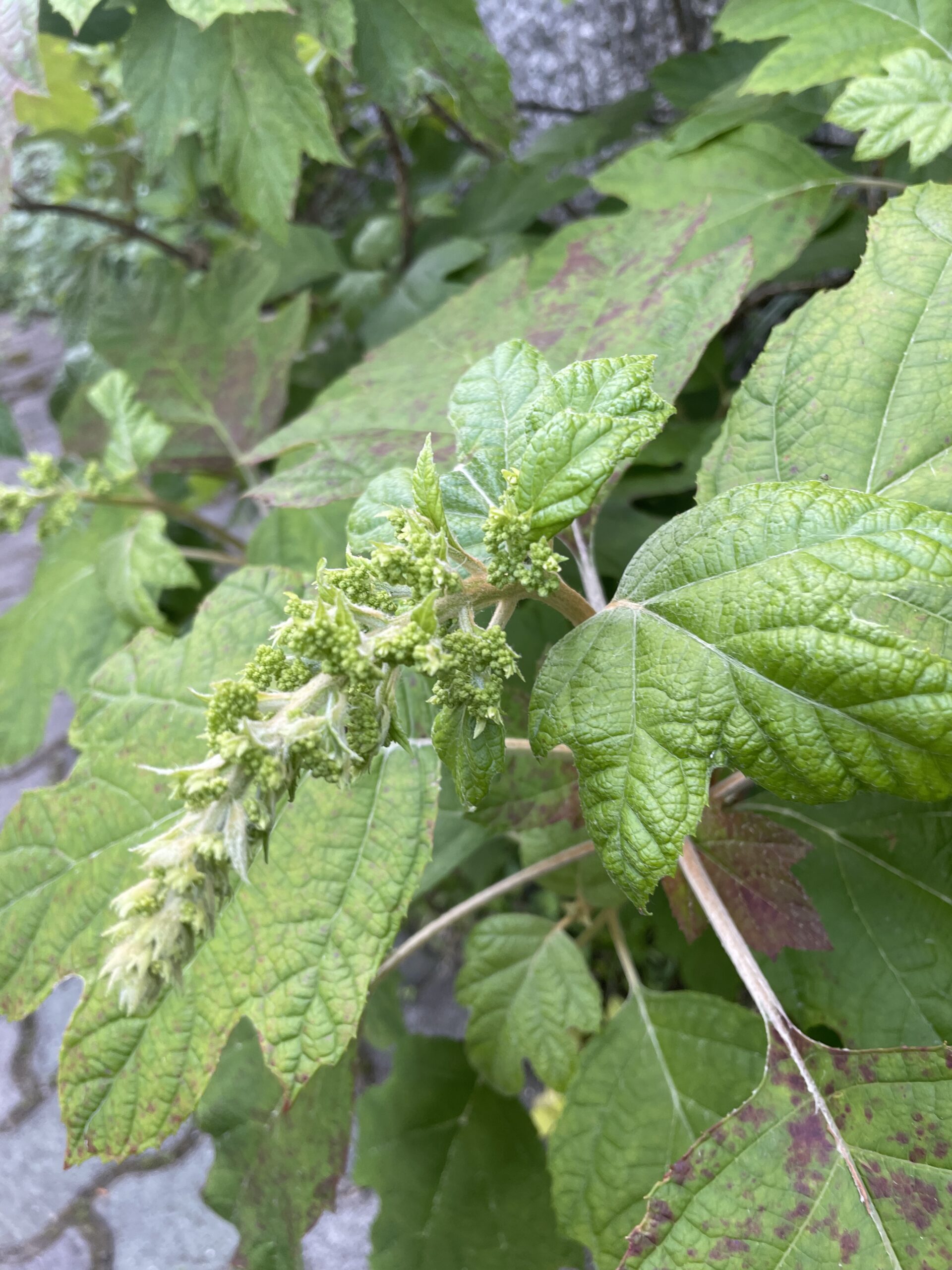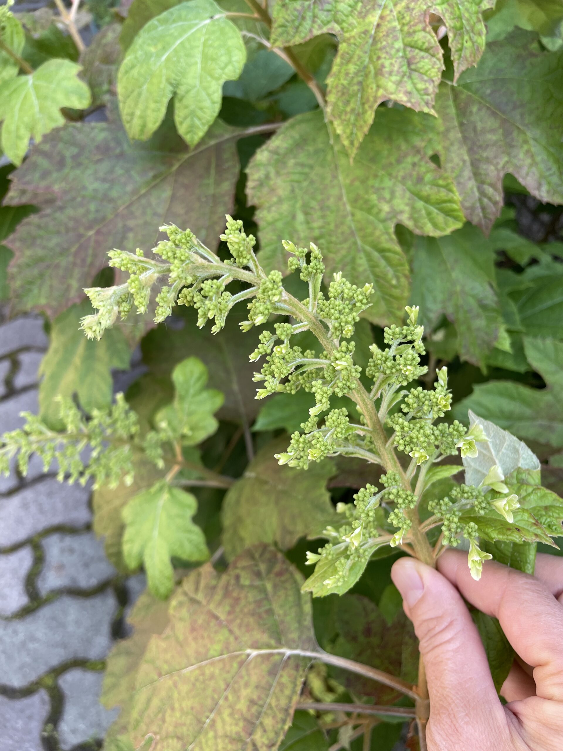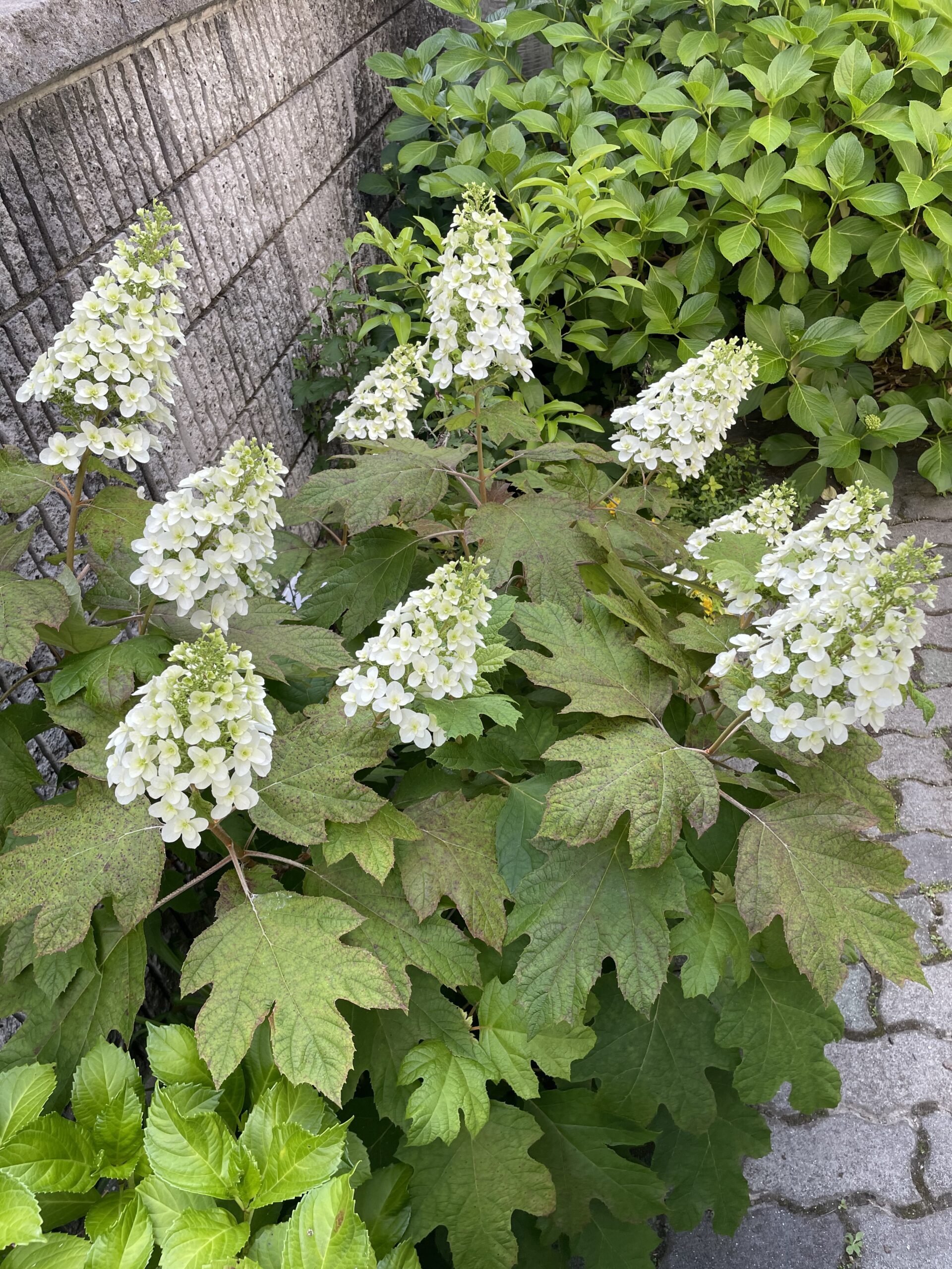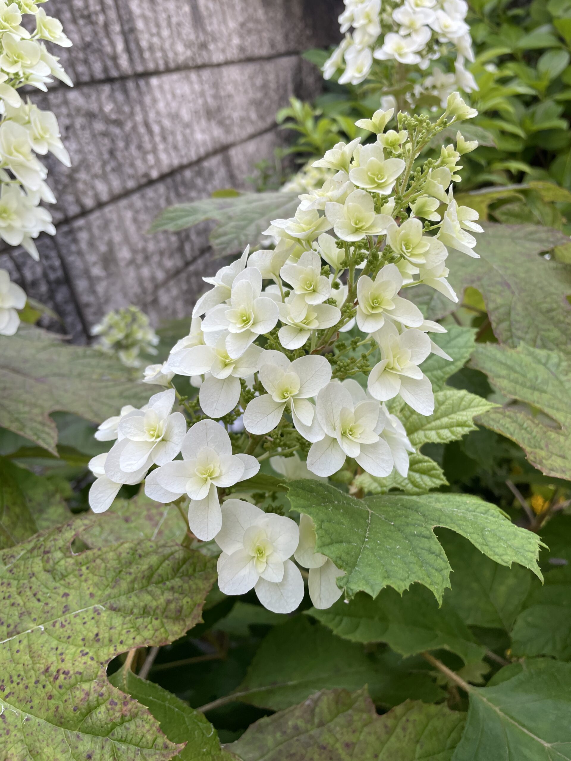 カシワバアジサイは丸じゃなくて、すらっと穂状になったピラミッド型の花を5月~7月頃に咲かせます。