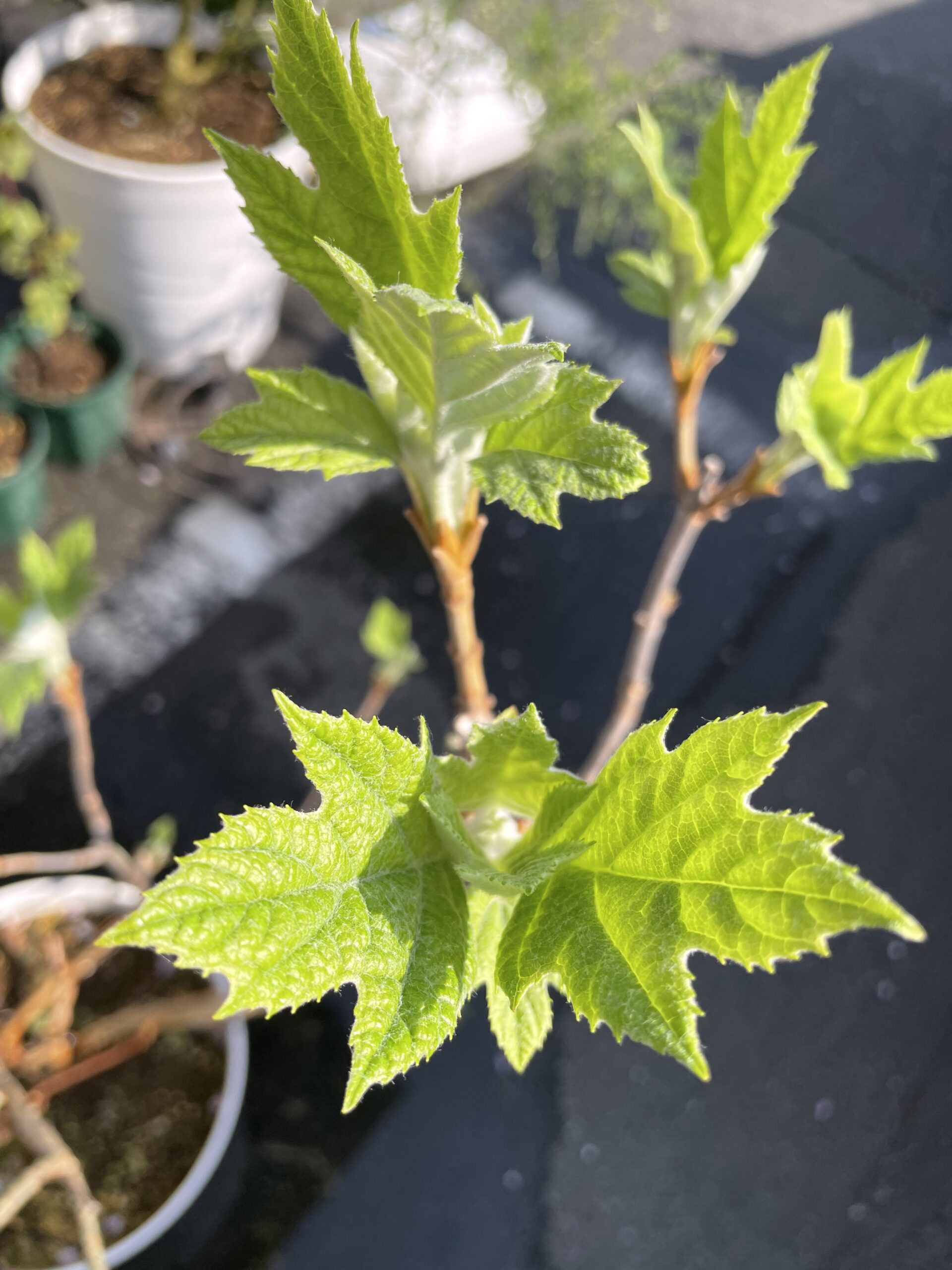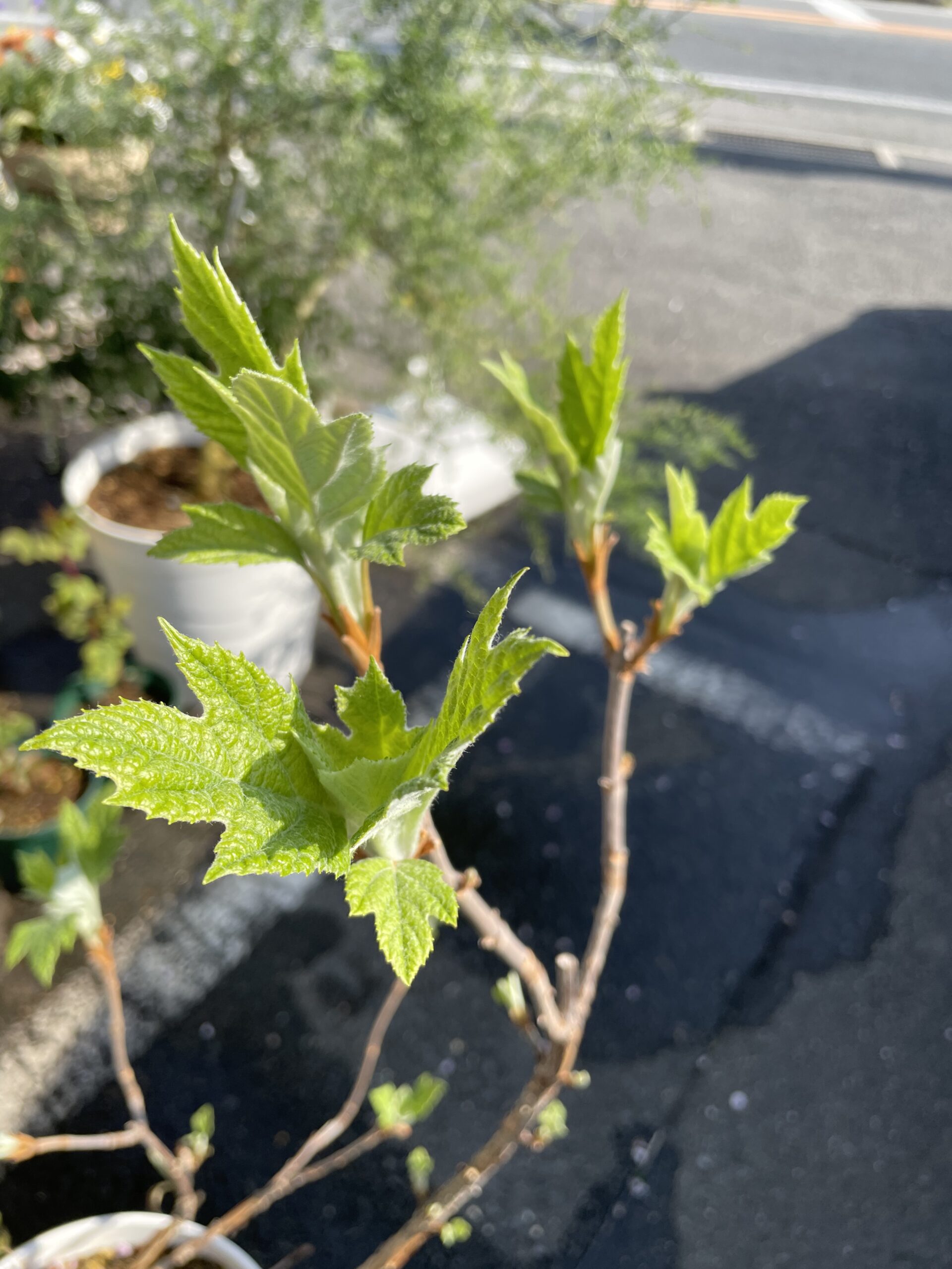 4月10日の様子↓ ↓ ↓地植え、鉢植え共に、葉が展開してきました。
