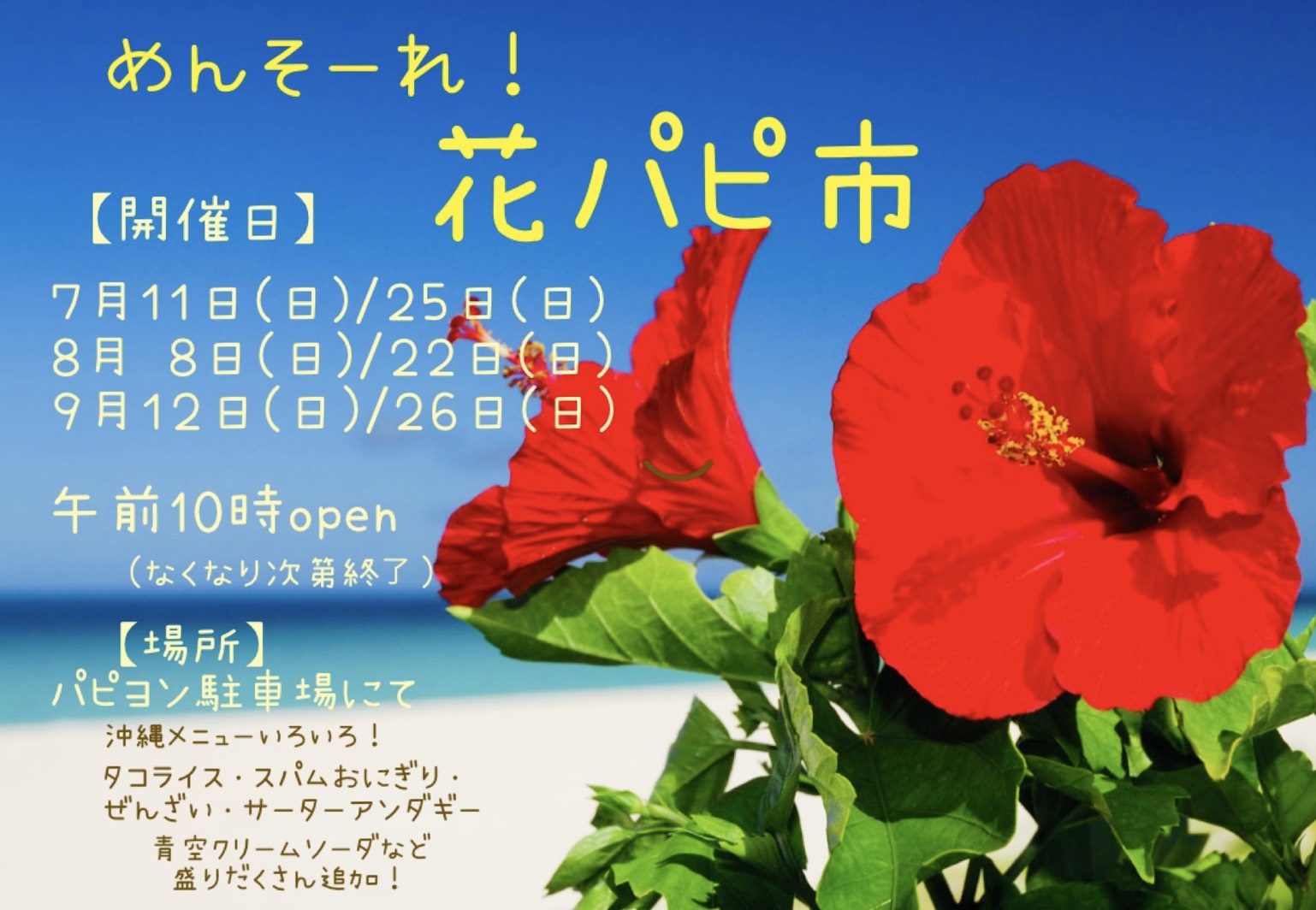 花パピ沖縄祭り(2021) 花パピ祭り(沖縄)ポストカード 2022.02.21 花パピ沖縄祭り🌺 昨年の花パピ市(沖縄)の様子です。 うちの和子ばぁばが沖縄出身🌺で沢山のお友達に来ていただき、大盛況でした😊😊 今年もぜひ開催したいなぁ🎵 ポストカード ありがとうございました! 顔出しパネルだよ 沖縄ぜんざいも メニュー表 お馴染みサーターアンダギー 青空クリームソーダ
