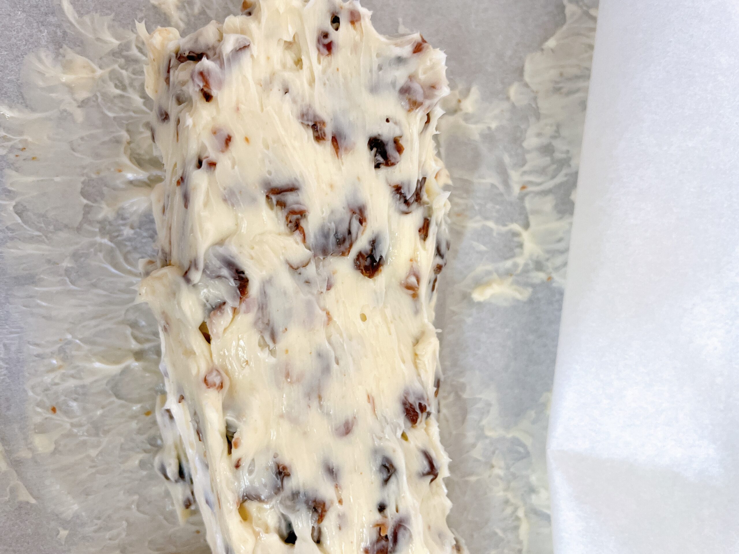 ⑥バターがなめらかになったらいよいよレーズン投入です。ここでは泡だて器を使わずにゴムベラで混ぜてくださいね