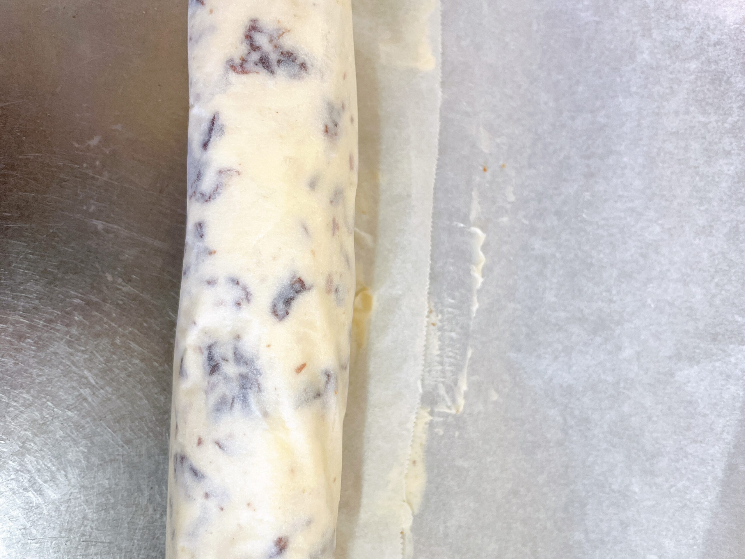 ⑦混ぜ終わったらクッキングシートを棒状に置きクルクルっと丸く巻いていきます。