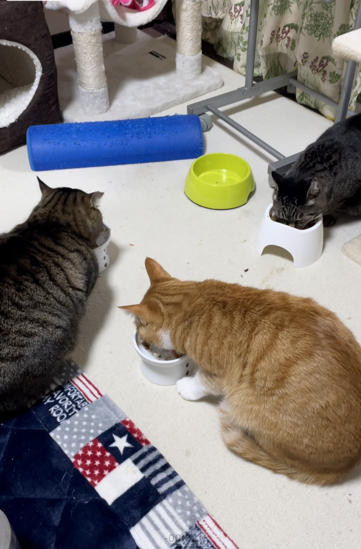 さんちゃんは、エイズに感染していますが、喧嘩をしなければ感染することはないので、私が家にいる時は隔離することなく三匹が一緒に家にいます🐾