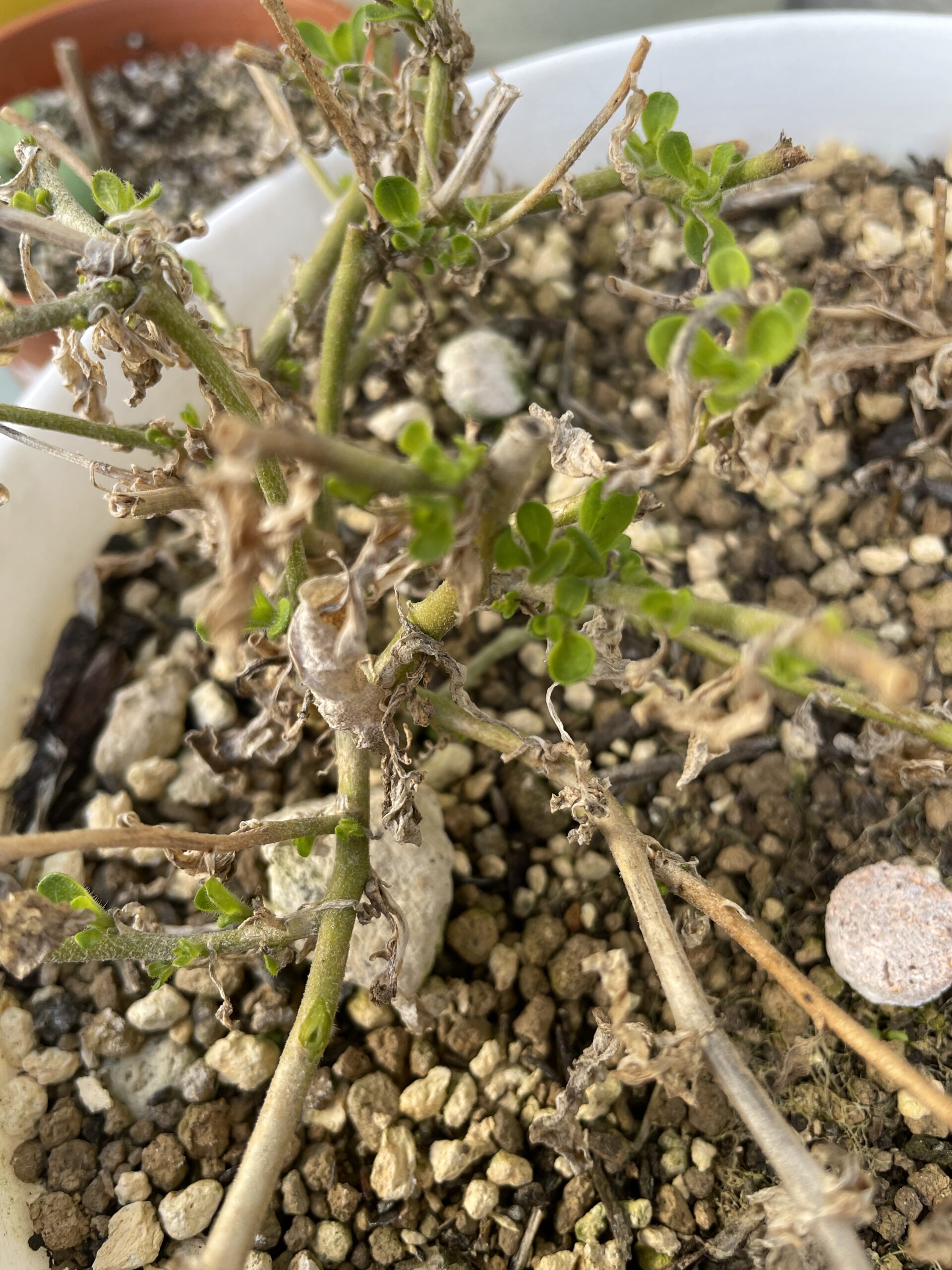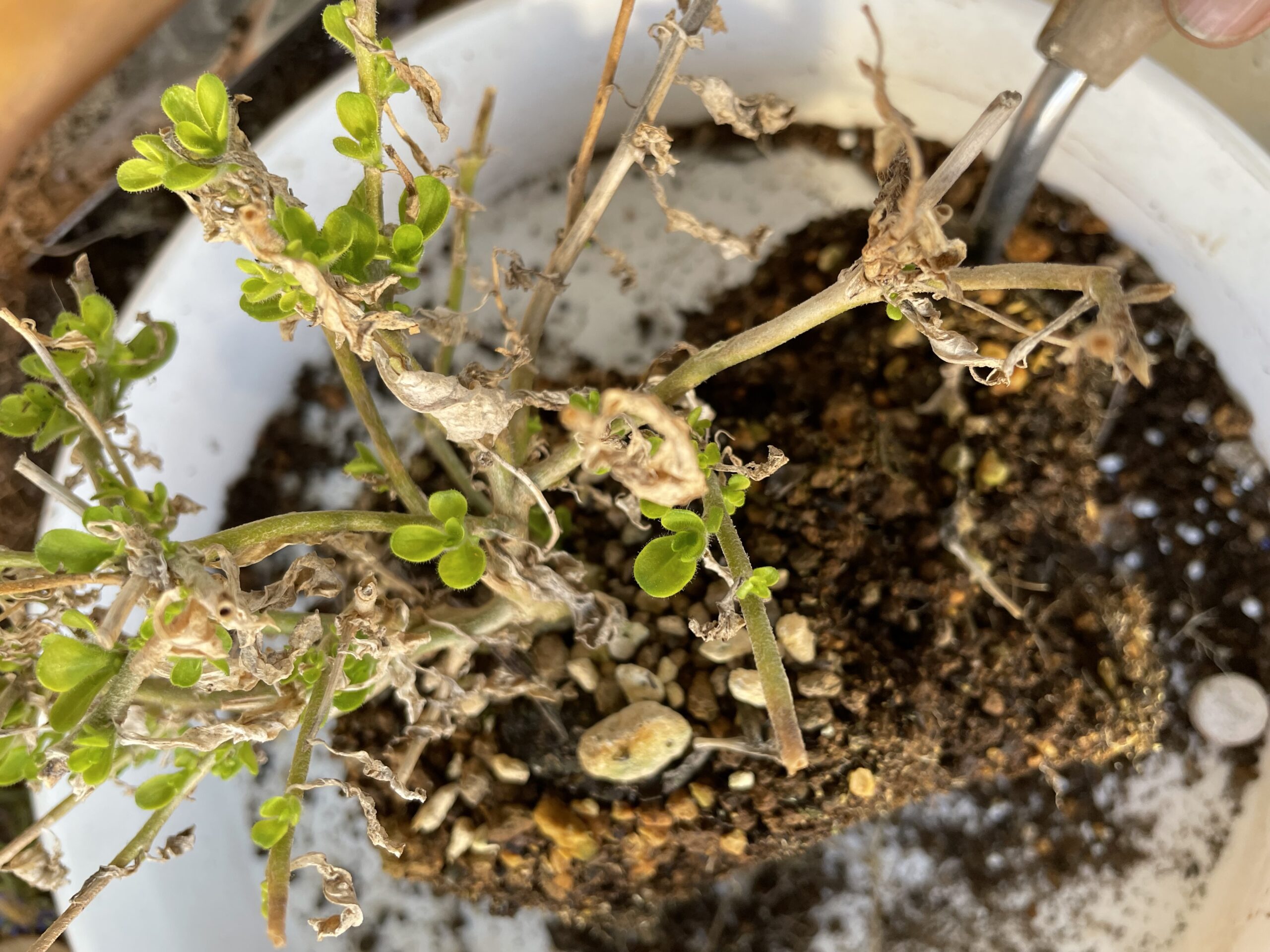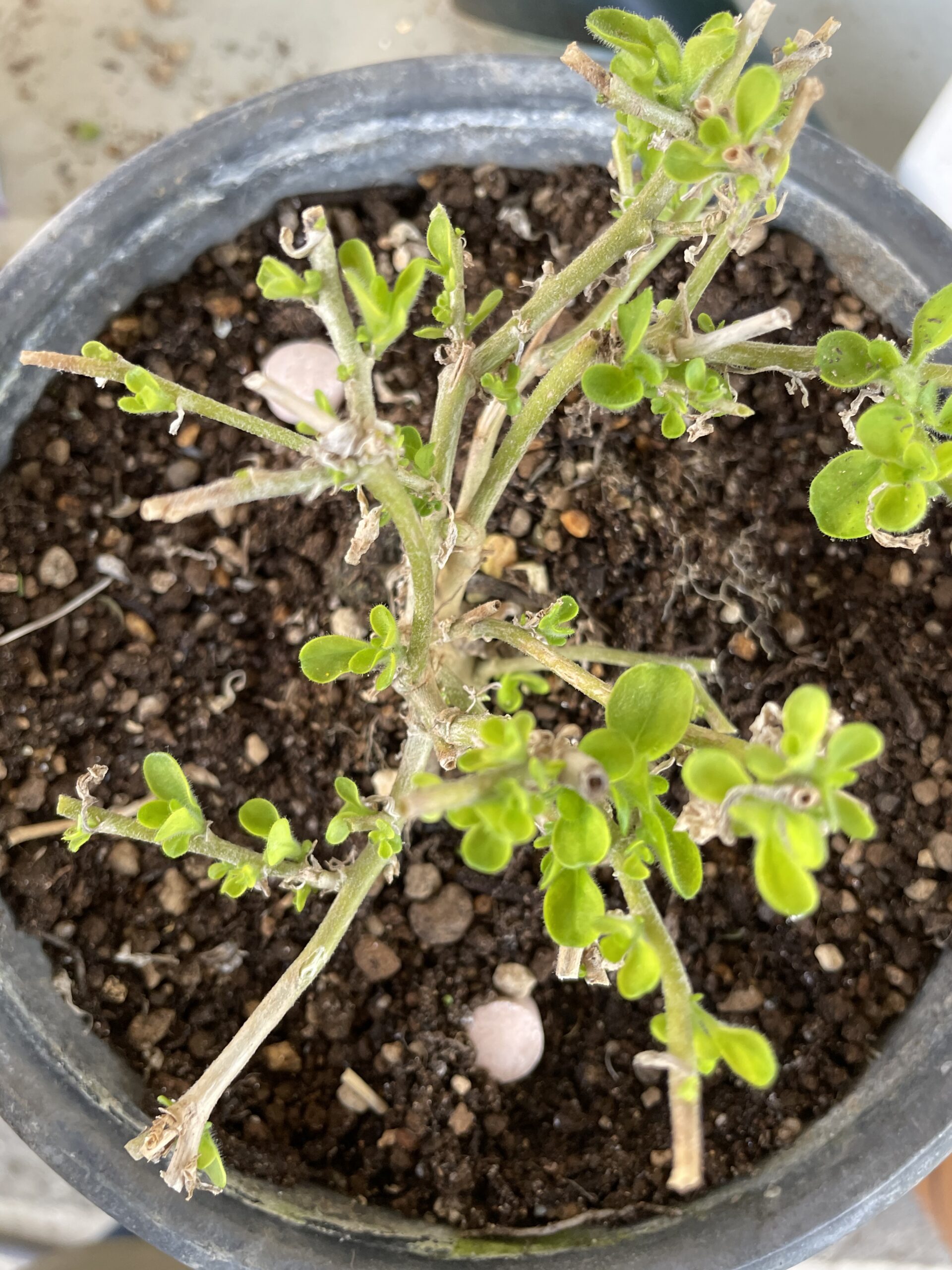 枝だけになってしまい、すでに枯れ果てていると思っていた💦可愛そうな状態のサフィニアだったのですが、(下の写真)