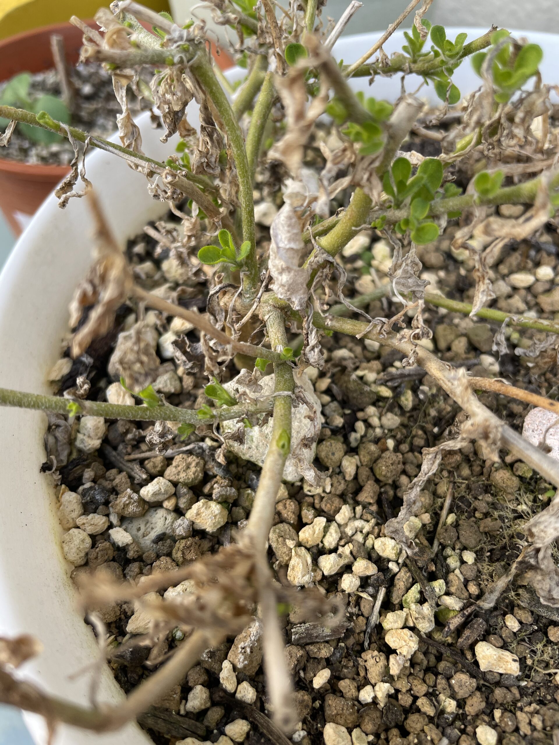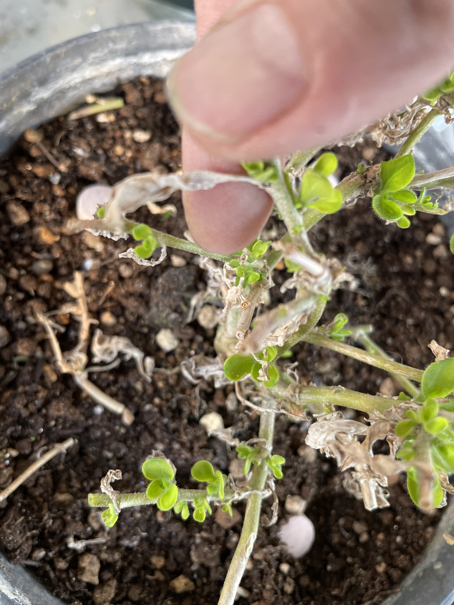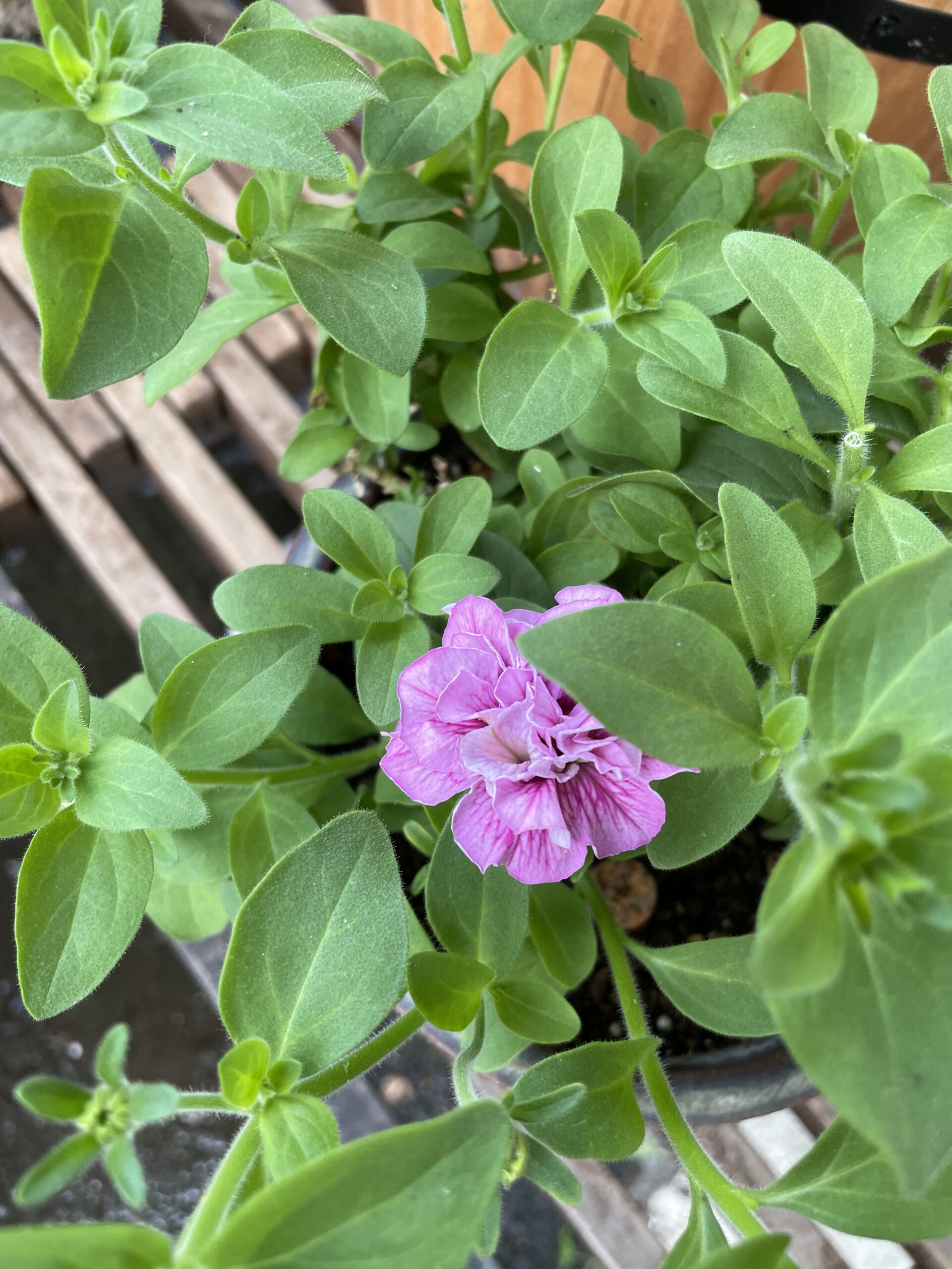 枝だけになってしまい、すでに枯れ果てていると思っていた💦可愛そうな状態のサフィニアだったのですが、(下の写真)