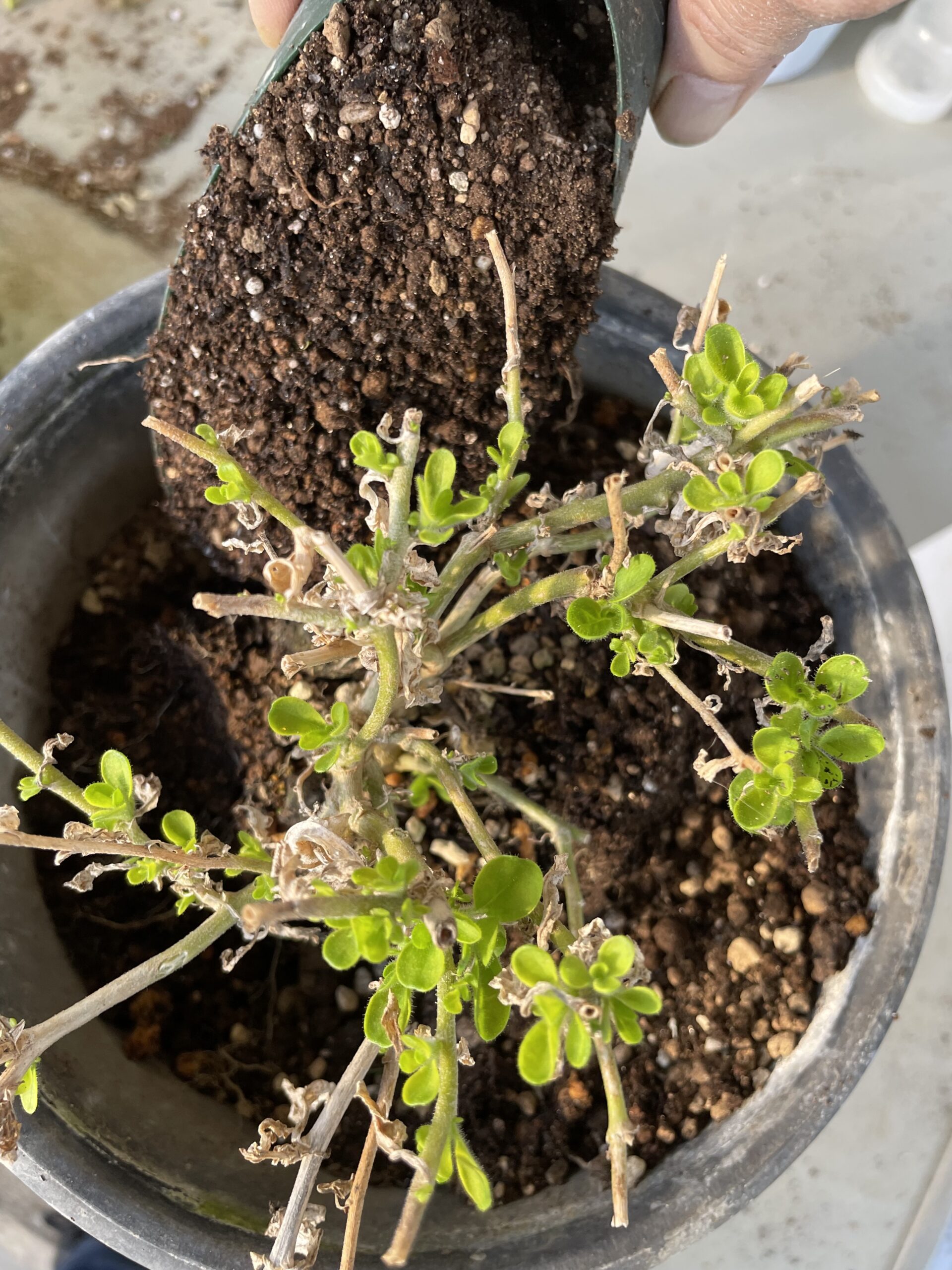 ☆昨年の鉢のまま、土の上に肥料を足しても、とりあえず花は咲きますが、花が小さくなってしまったり、枝ぶりがひょろっとした弱々しい株に育ってしまい、土替えしないことによって病害虫の発生する確率があがってしまいますので、この先の厳しい夏をこえて、秋までお花を楽しむために、土を新しくし、元肥を入れてあげて植え替えをしましょう。