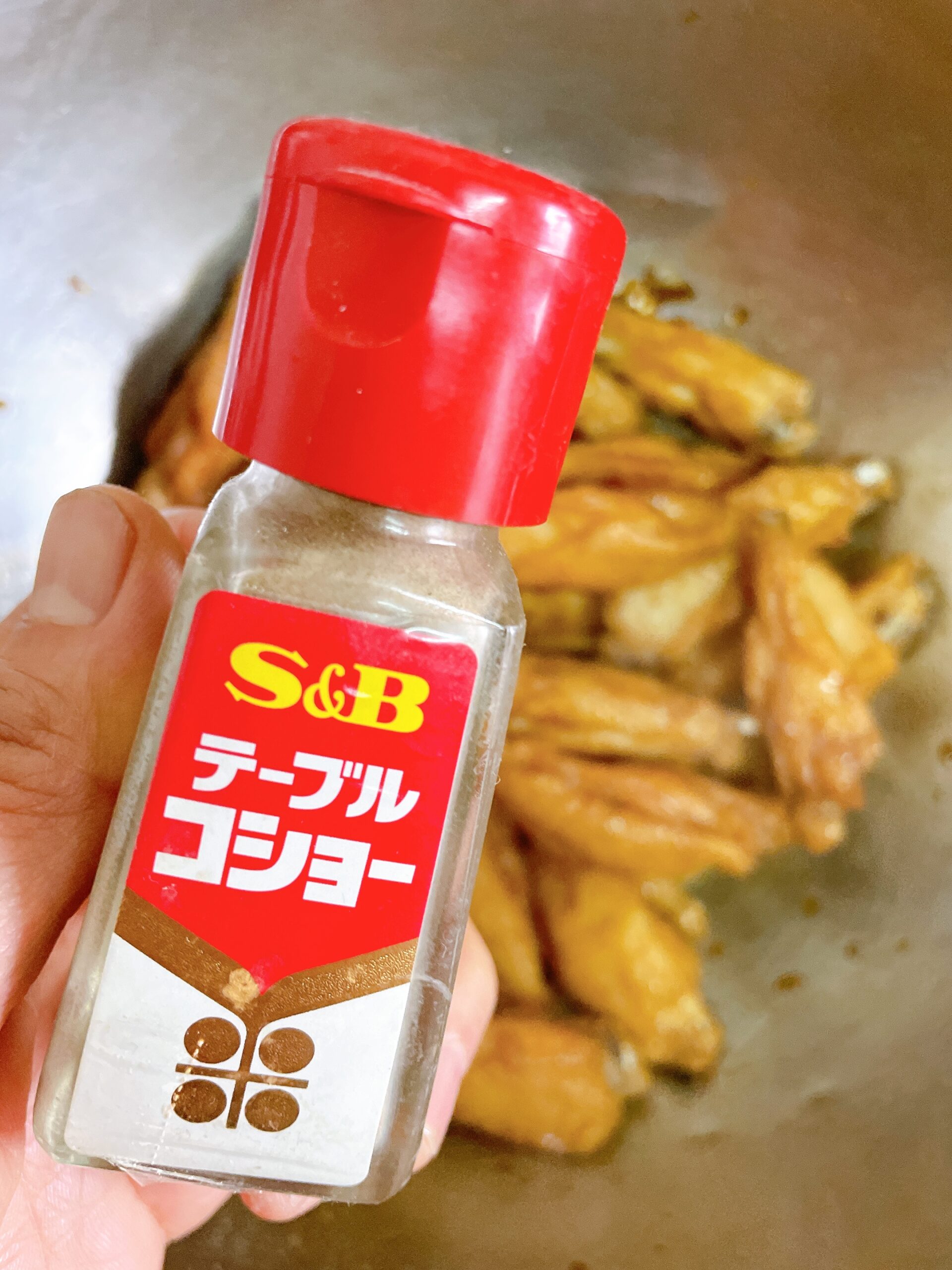 ⑤最後に揚がった手羽先に先ほどのタレを全体にまんべんなく回しかけます。仕上げにコショウ(スーパーで売っているテーブルコショウがおすすめです)をたっぷりふりかけ完成です。