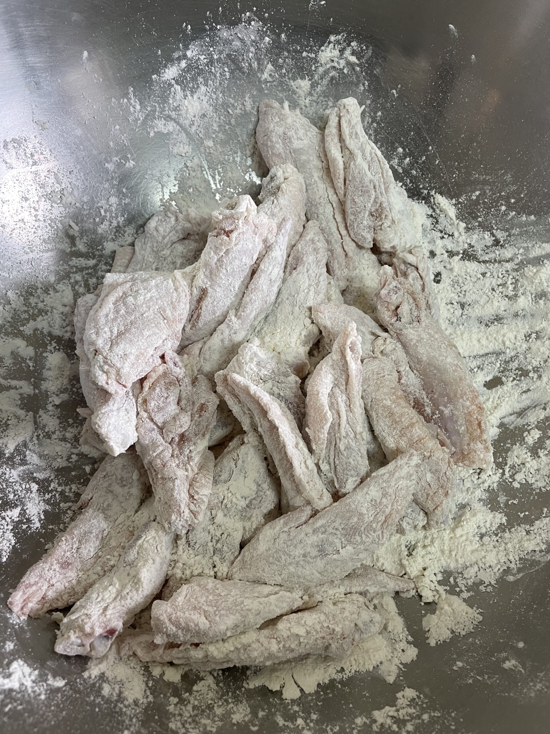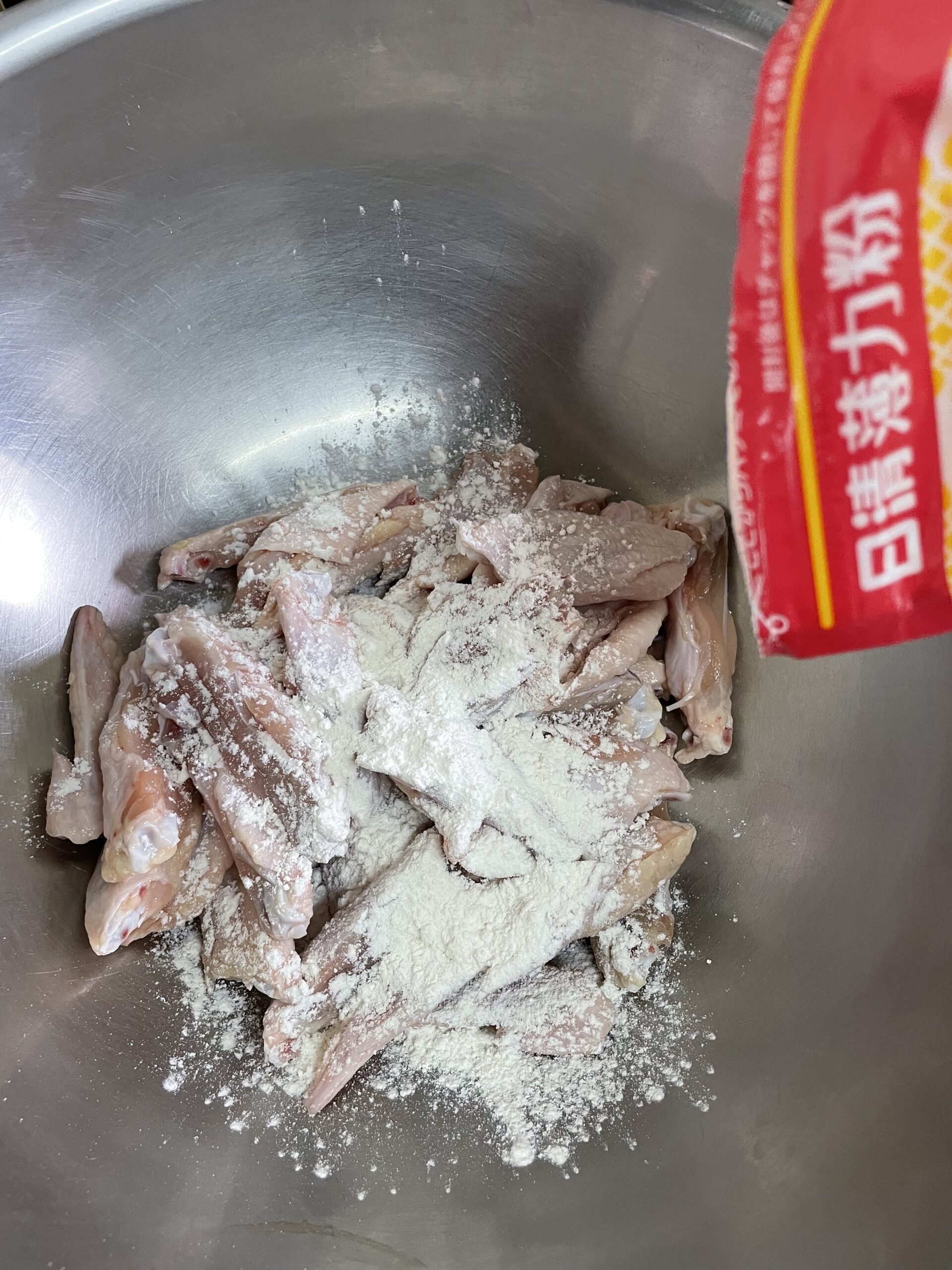 ③続いて手羽先の水分をキッチンペーパーで拭い、まんべんなく小麦粉をまぶしてくださいね。余分な粉はポンポンと落としておきましょう。