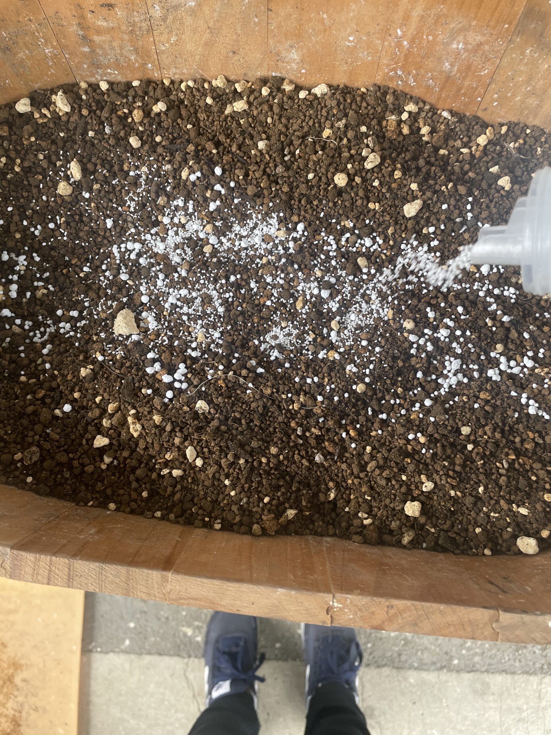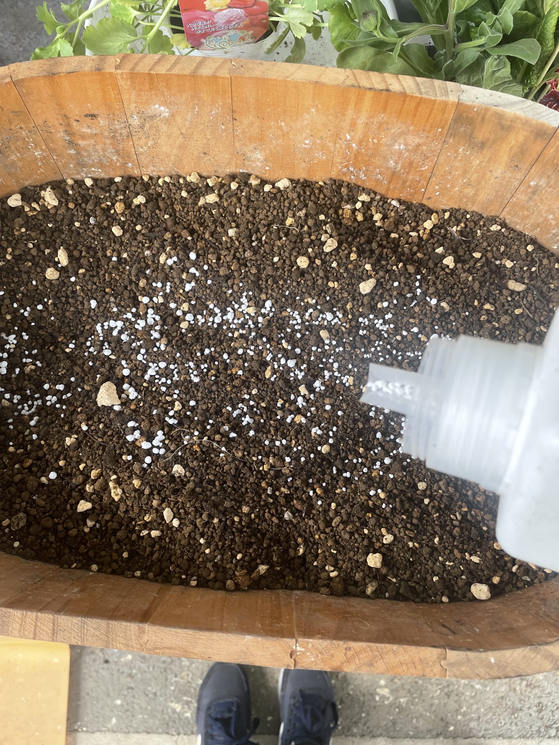 私はいつも土は手作りするので、土を入れた後にマグアンプとオルトランをパラパラと振り入れます。